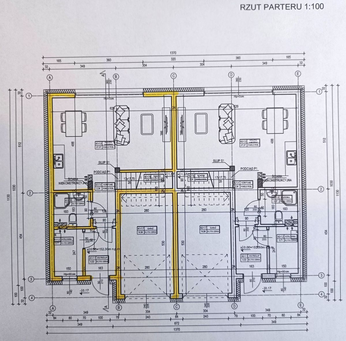 - Parter (57,90 m²): przestronny salon z aneksem kuchennym (27,37 m²), łazienka, kotłownia, korytarz, wiatrołap, schody na piętro oraz przestronny garaż.