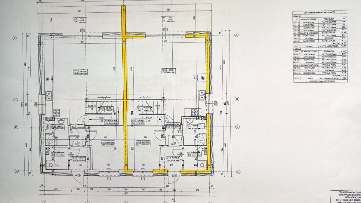 Budynek wybudowany w tradycyjnej technologii, o powierzchni użytkowej 102,18 m², z dachem krytym dachówką marki BRAAS. Ściany z bloczków betonu komórkowego Suporex (grubość 24 cm), docieplone styropianem o grubości 20 cm, pokryte tynkami silikonowymi. Wewnątrz stropy ocieplone wełną mineralną (30 cm). Okna PVC trzyszybowe z zewnętrznymi roletami elektrycznymi, drzwi tarasowe przesuwne, a zewnętrzne parapety wykonane z granitu, co podkreśla elegancki charakter domu.