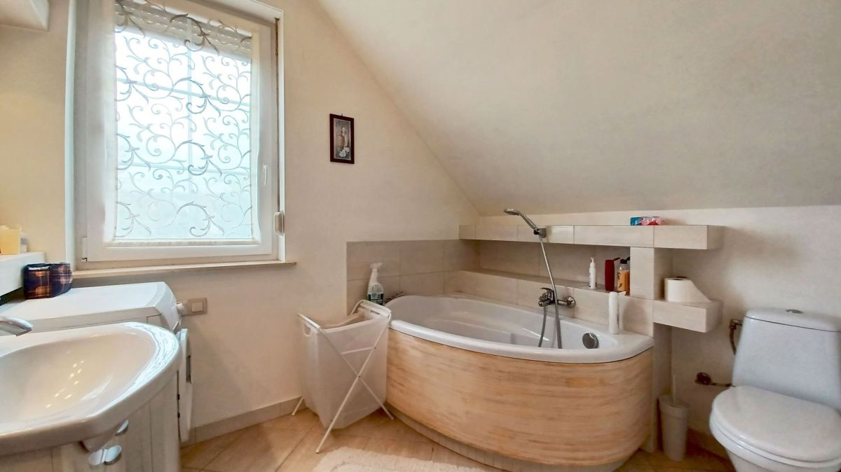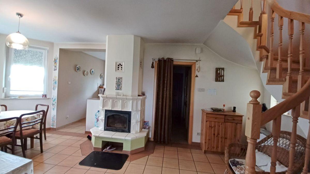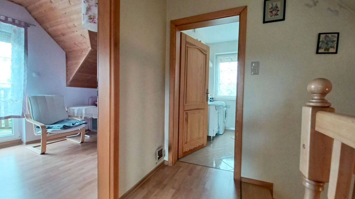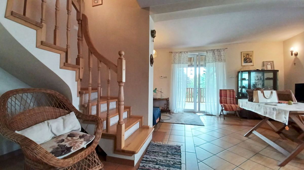 Wnętrze domu zachwyca jasnymi pastelowymi ścianami, podłogi na parterze poktyte są eleganckimi płytkami, a na poddaszu panelami o ciepłej kolorystyce. Jasne, drewniane schody prowadzą na poddasze. Łazienki wyłożone glazurą, zapewniają komfort i funkcjonalność. Kuchnia w pełni umeblowana i wyposażona, gotowa na codzienne potrzeby.