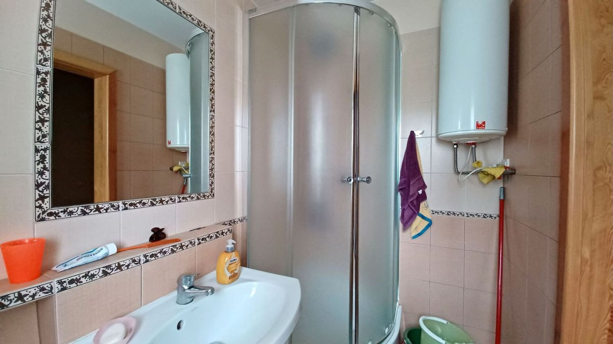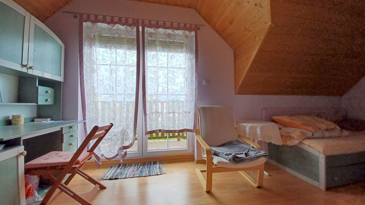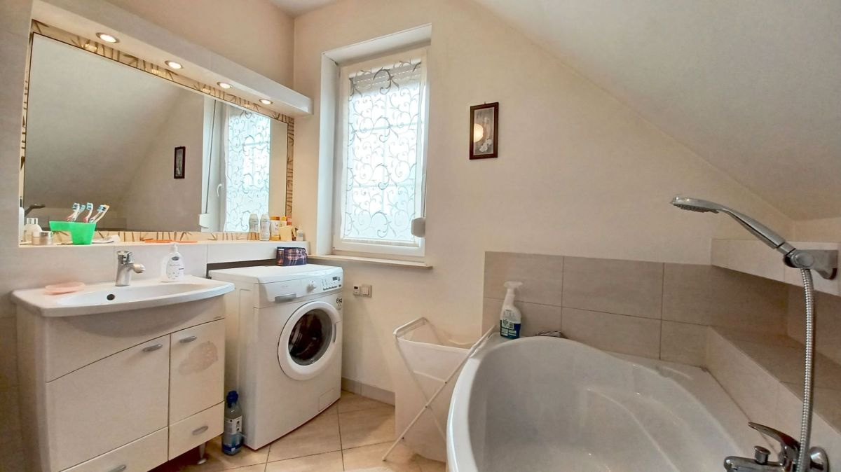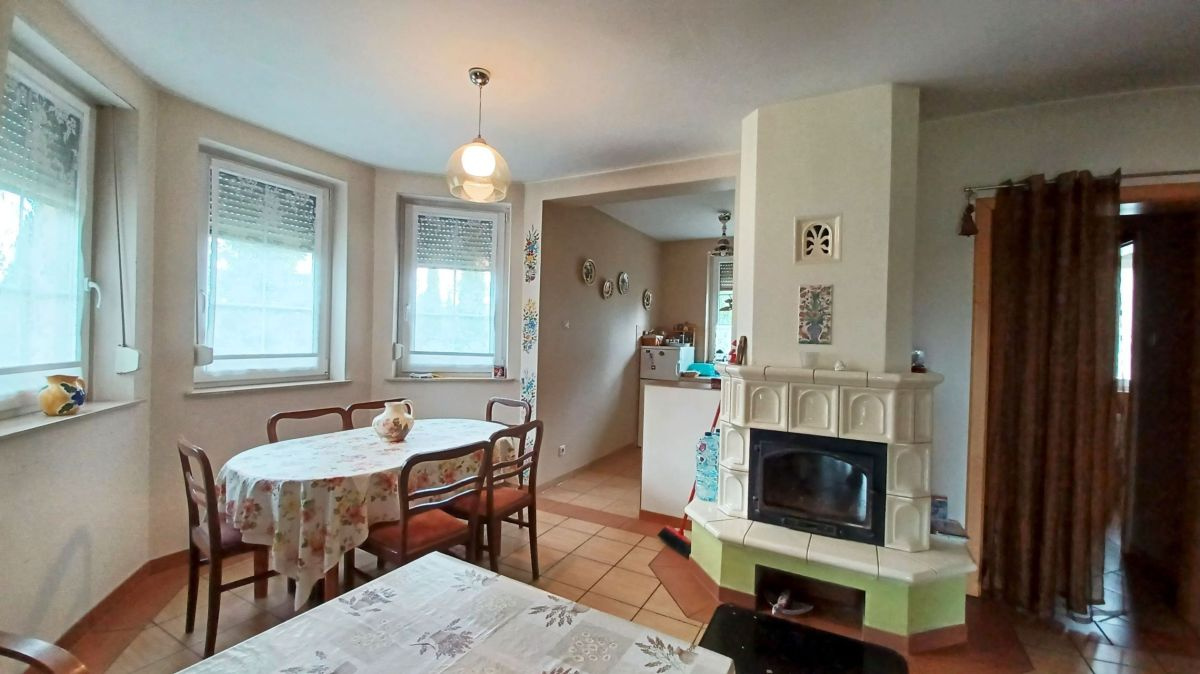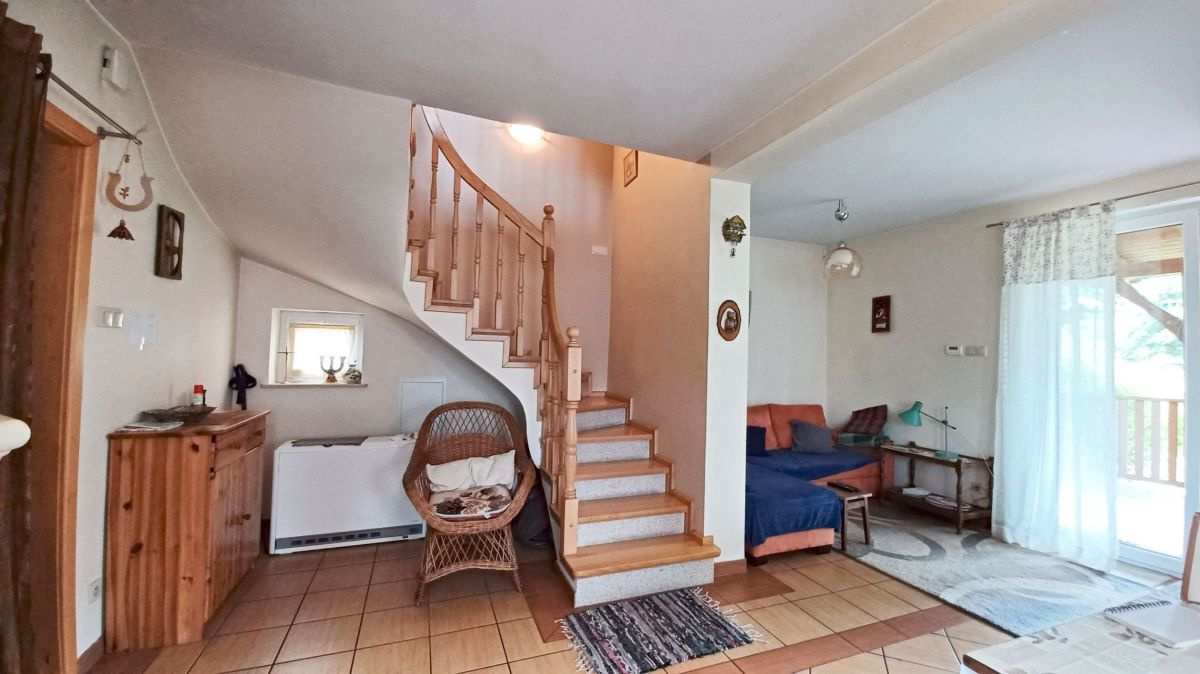 Wnętrze domu zachwyca jasnymi pastelowymi ścianami, podłogi na parterze poktyte są eleganckimi płytkami, a na poddaszu panelami o ciepłej kolorystyce. Jasne, drewniane schody prowadzą na poddasze. Łazienki wyłożone glazurą, zapewniają komfort i funkcjonalność. Kuchnia w pełni umeblowana i wyposażona, gotowa na codzienne potrzeby.