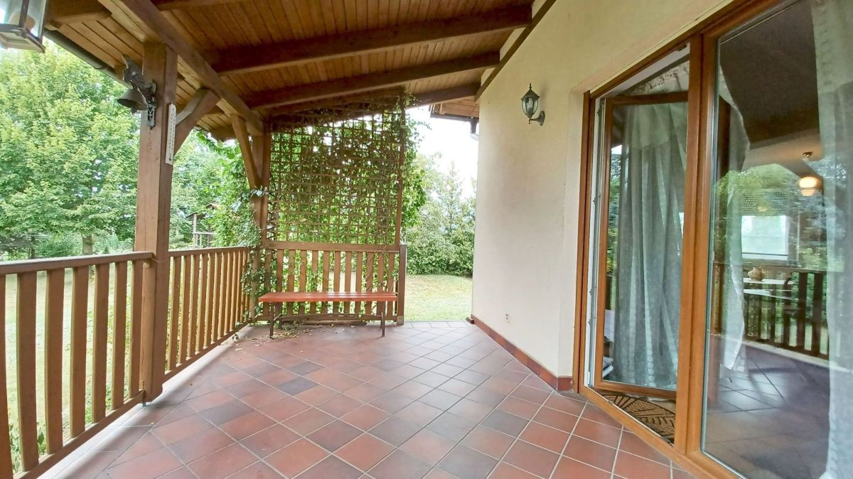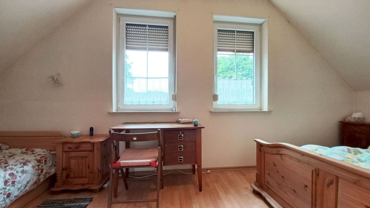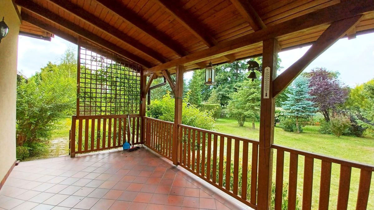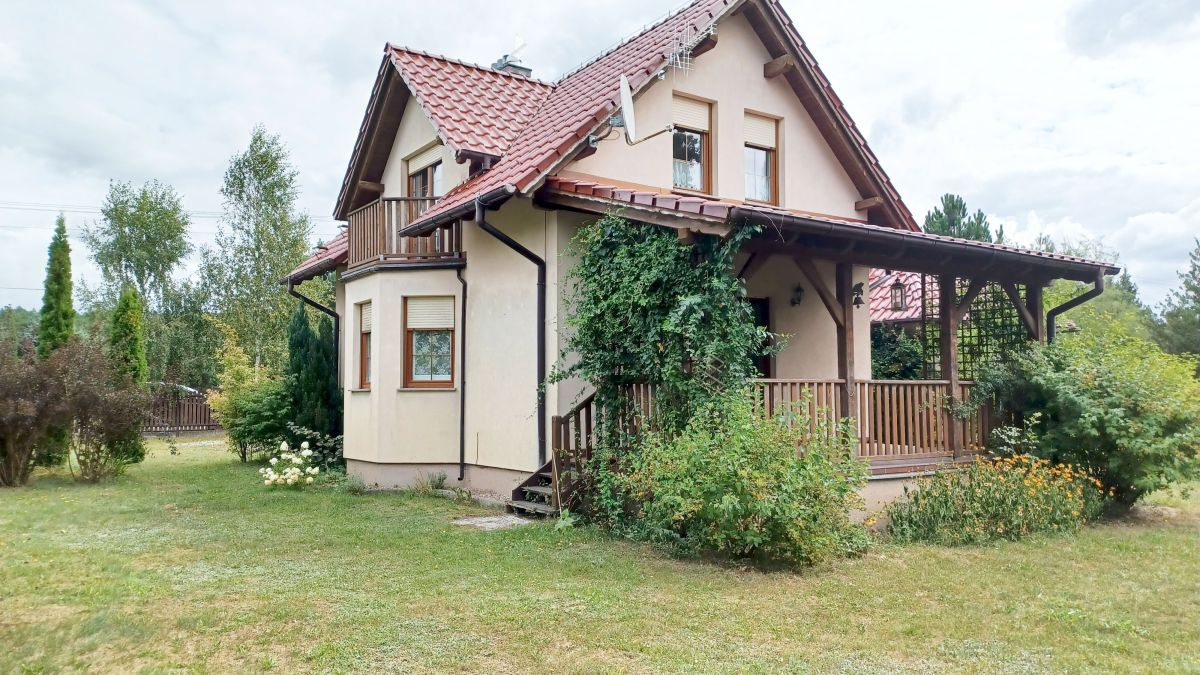 Budynek jednorodzinny, wolnostojący, paterowy z poddaszem użytkowym, wybudowanyw technologii tradycyjnej murowanej - ściany z bloczków betonu komórkowego (24 cm) ocieplone wełną mineralną (12 cm), ściany wewnętrzne nośne - bloczki z betonu komórkowego (24 cm), a ściany działowe - cegła kratówka (12 cm), dach dwuspadowy pokryty dachówką ceramiczną ROBEN, a okna PVC zabezpieczone roletami zewnętrznymi. Dom jest w pełni przystosowany na cały rok, z przestronnym poddaszem użytkowym, które dodaje przestrzeni i funkcjonalności. Do nieruchomości przynależy również garaż wolnostojący o powierzchni użytkowej 24,80 m², murowany z pomieszczeniem gospodarczym, z dachem czterospadowym krytym dachówką ceramiczną.