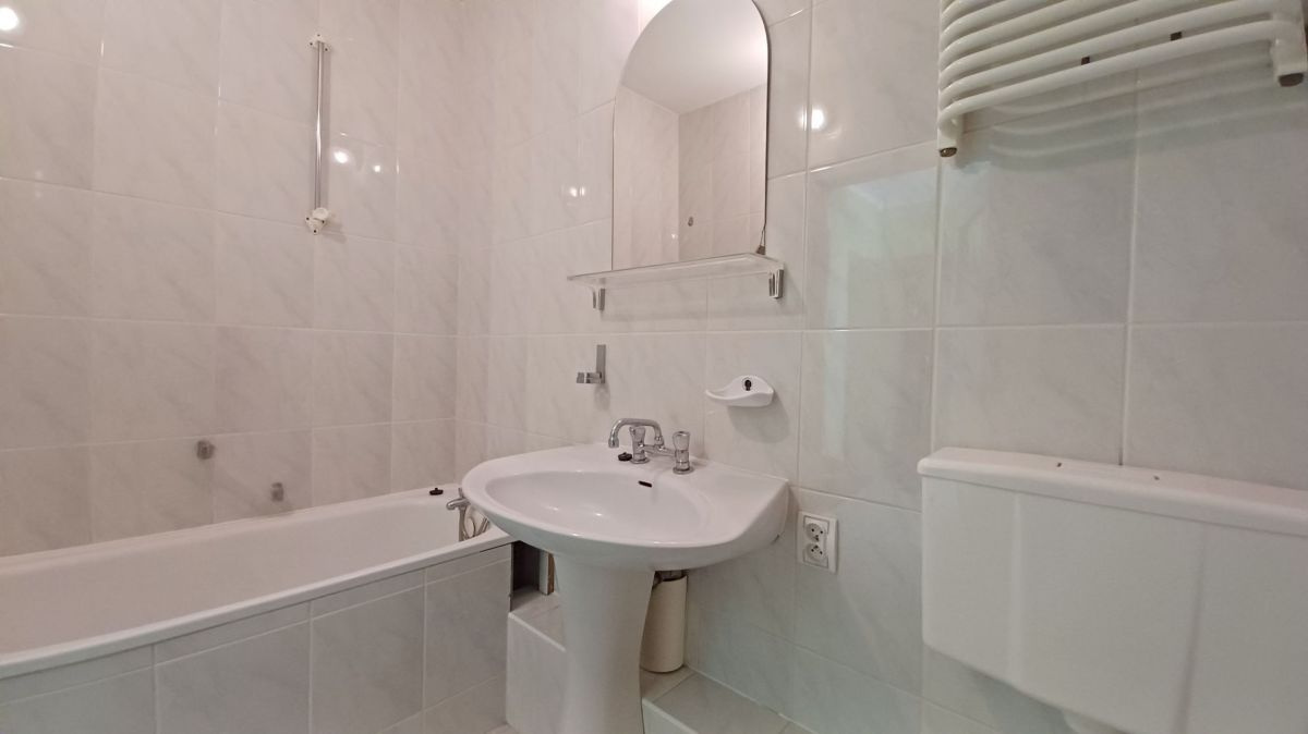 - Łazienka wykończona glazurą, z wanną i pralką,